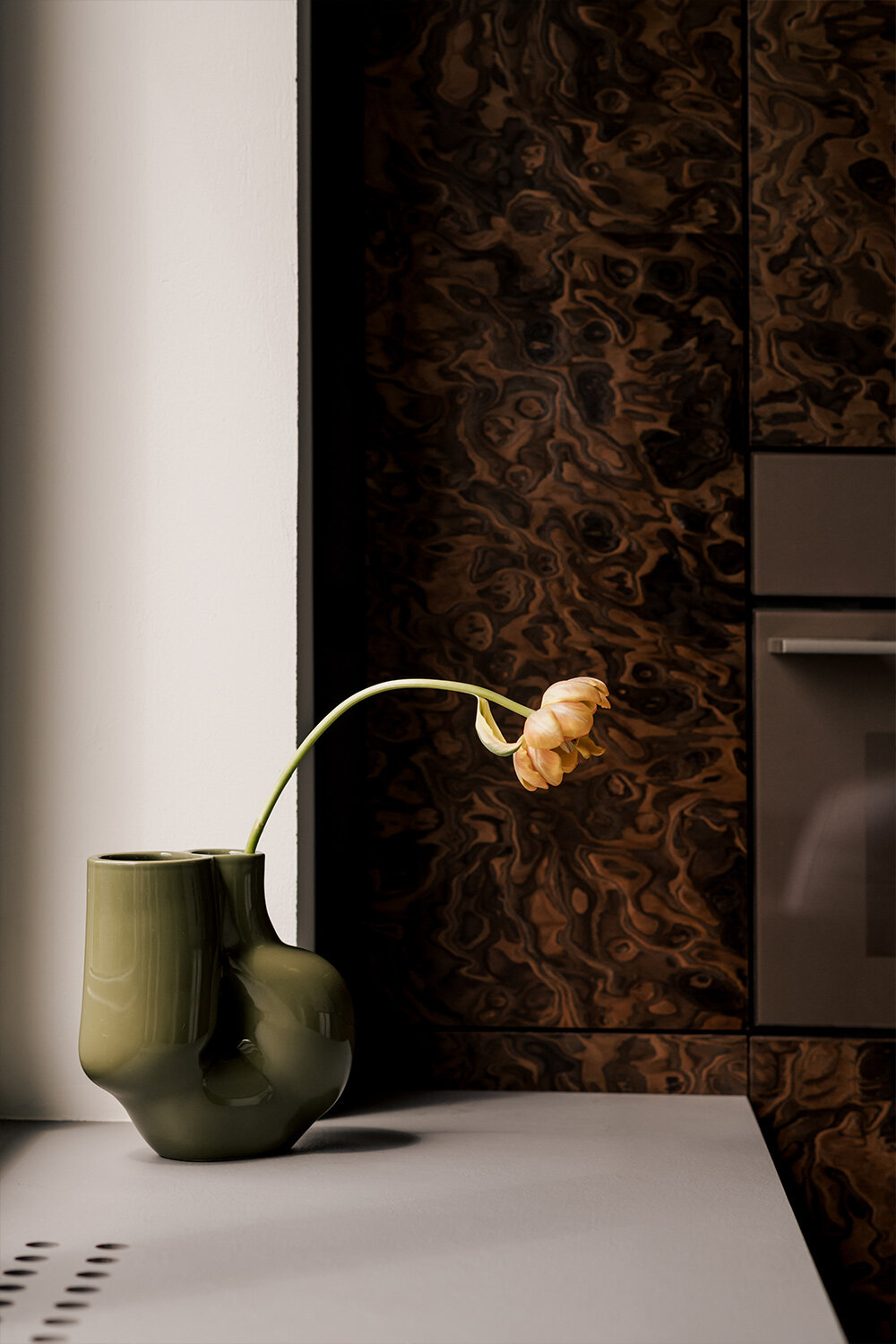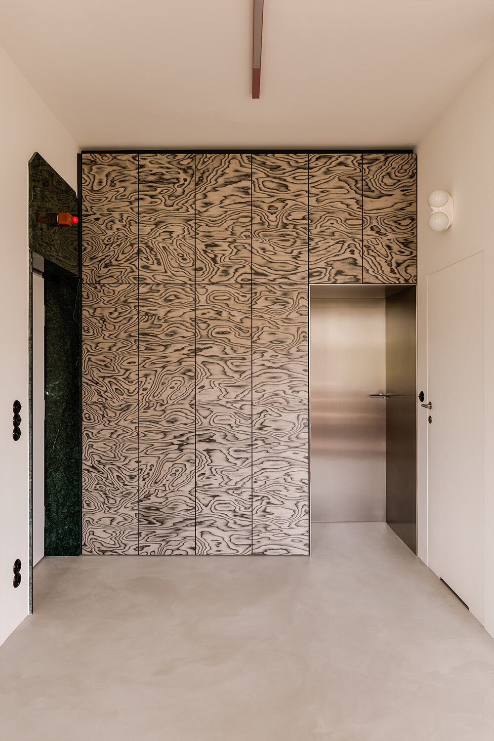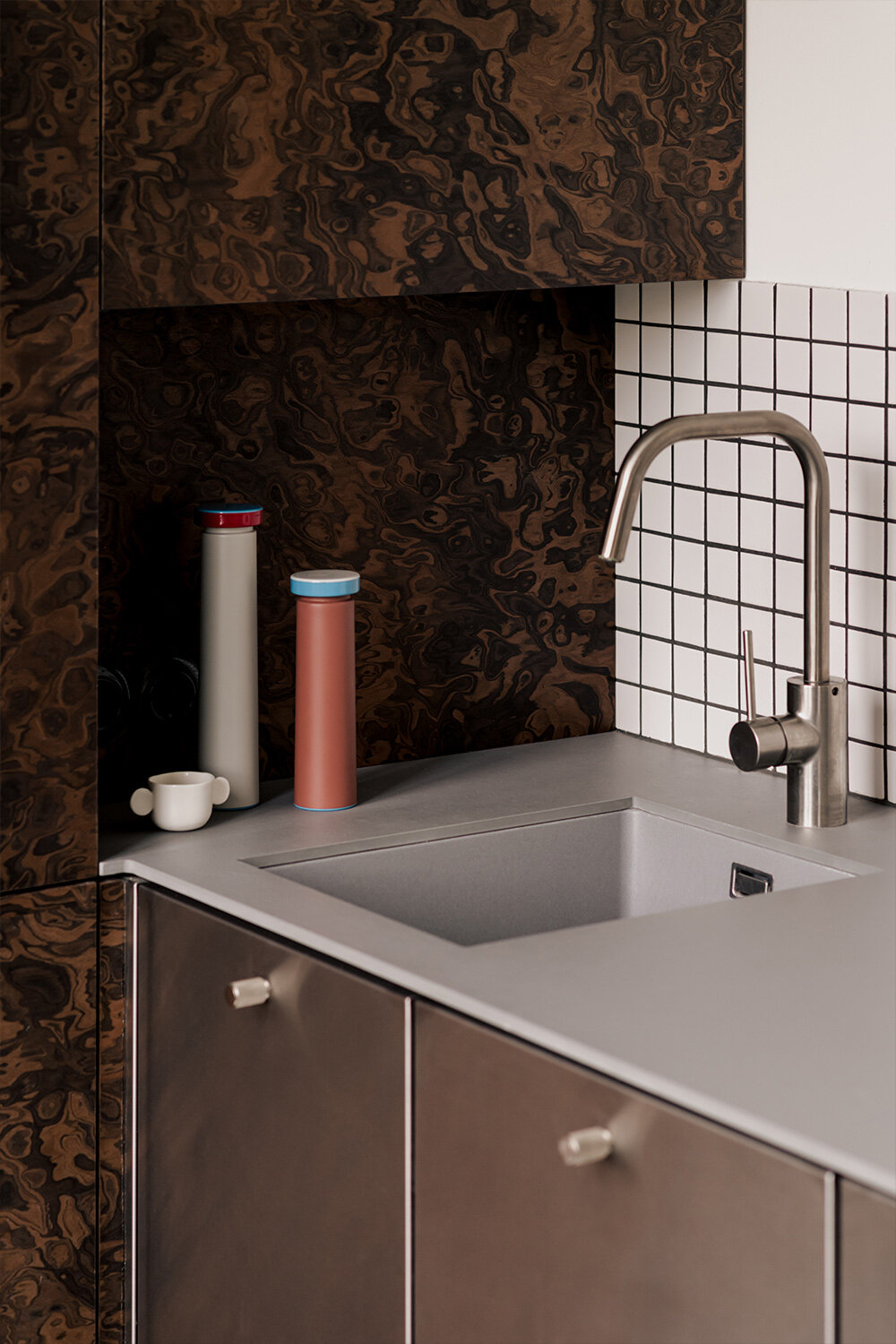 Elaborating on their layout intervention, Marcin says: ‘Although we considered numerous options, eventually, we ended up connecting the small kitchen with the living room. We also decided to leave the bathroom in the same spot and connect the utility room with the dressing room and the bedroom.’ Starting with the kitchen area, a piece of tall built-in furniture made of American walnut burl constitutes the main feature, glistening with its veneer finish. The organic pattern steadily contrasts with the smooth surface of brushed steel cabinets and the rigorous geometry of simple white tiles lining part of the wall.
