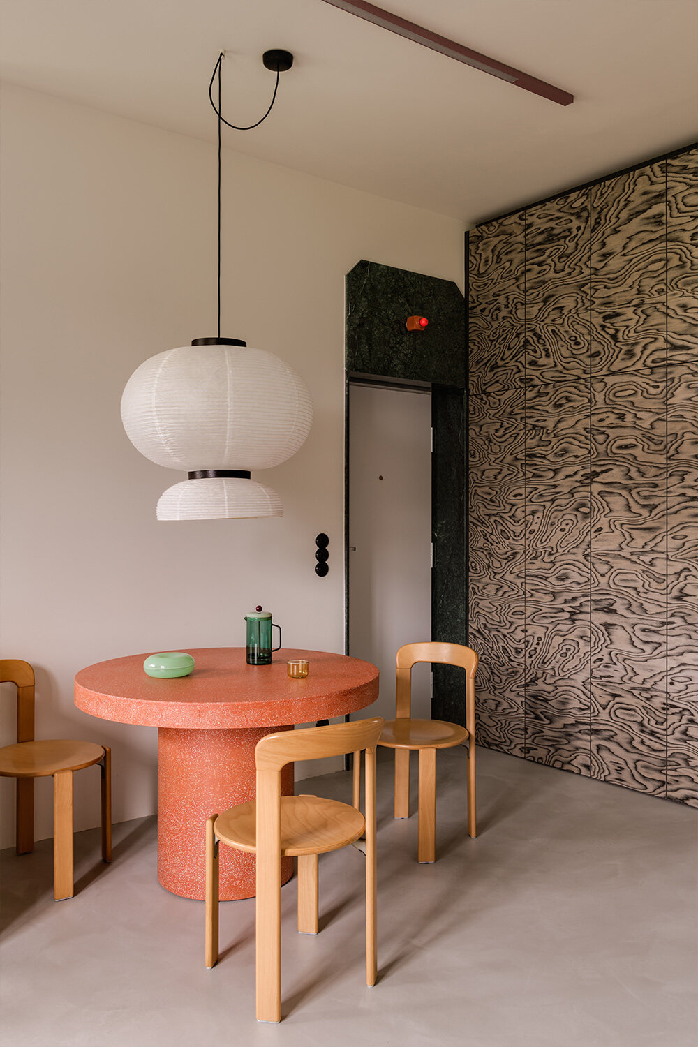 mistovia's memphis-style apartment in warsaw blends pink terrazzo, steel & walnut burl