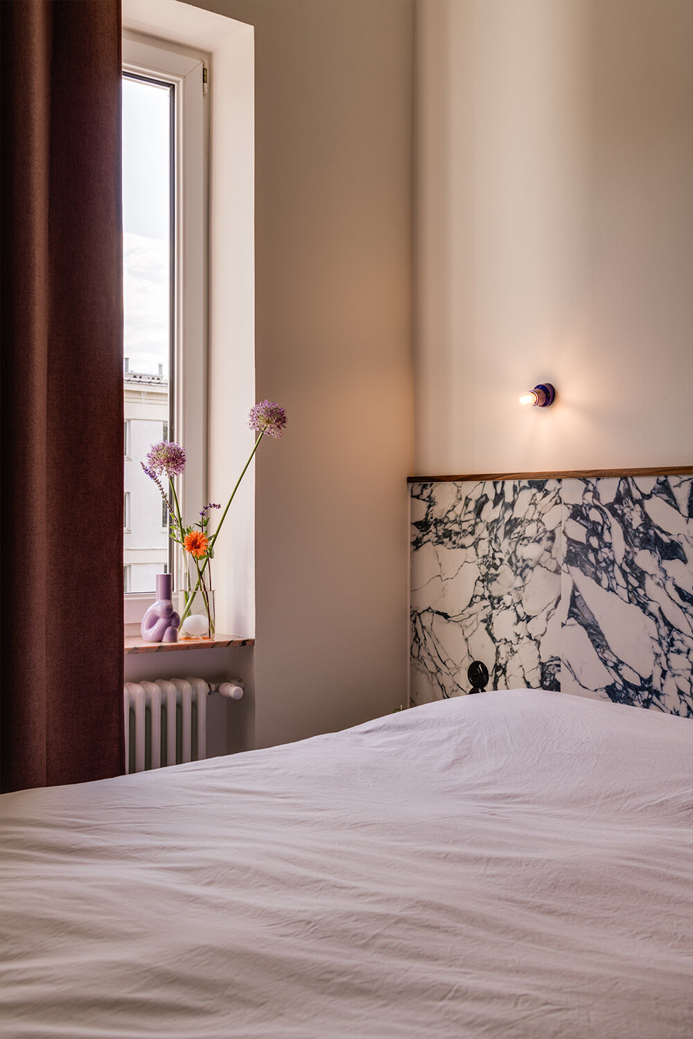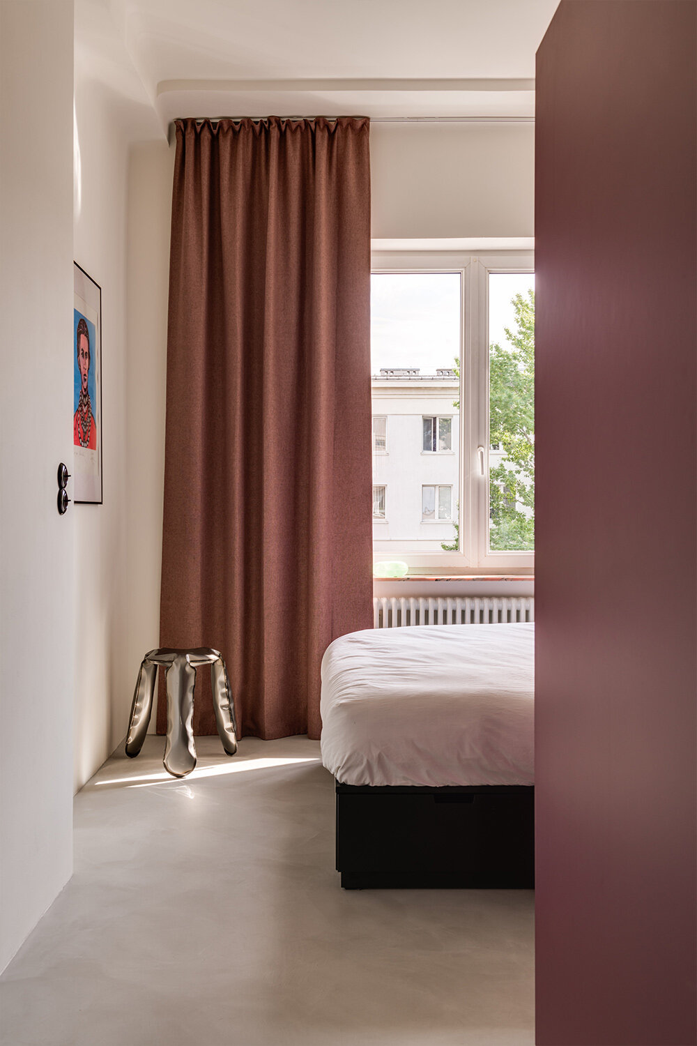 The second spatial ‘accent’ or cube welcomes guests upon entering the apartment. After crossing the portal finished with Brazilian green marble, their eyes take in a psychedelic motif, originally created by nature, but later refined by post-modernist Ettore Sottsass. It houses a wardrobe finished with an impressive veneer designed by Sottsass in 1985. The pink terrazzo round table and the vintage oblong chairs designed by Bruno Rey pay homage to the Memphis Group aesthetics. Meanwhile, a steel door in the closet leads to Paulina’s bedroom, dominated by a purple shade mixed with navy accents (porcelain sconces and Italian tiles on the bed’s headboard). The large room accommodates a functional, cube-shaped wardrobe and a utility room, concealed by white built-in furniture — effectively separating the living area from the private part of the home.