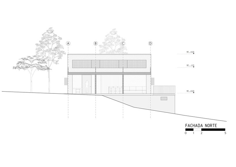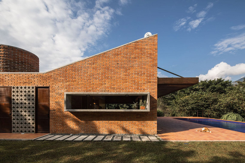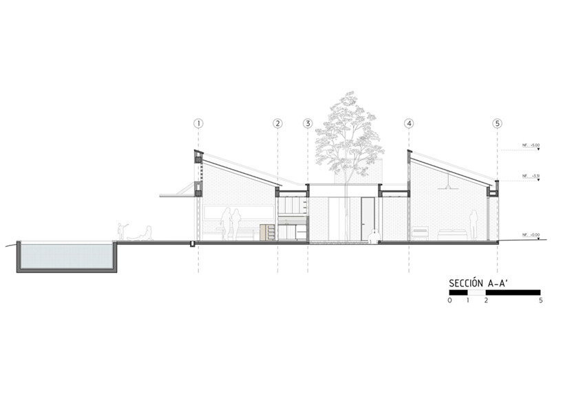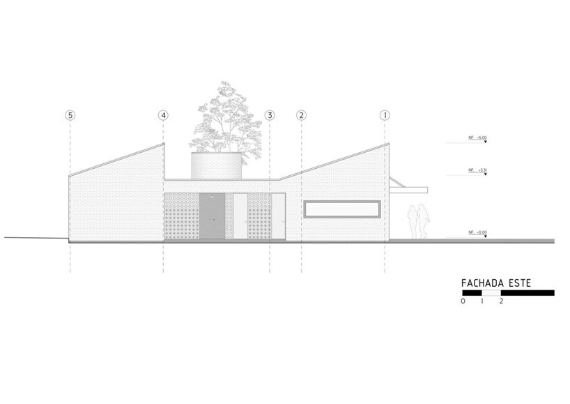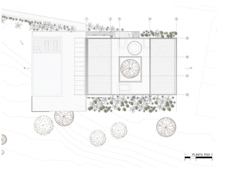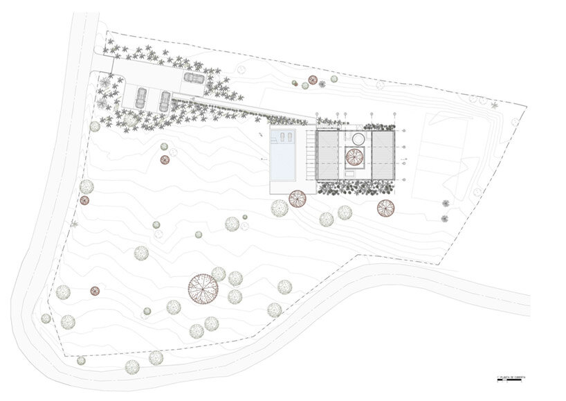 the project sits like a ring placed over the terrain, with its funnel-like roof forming a shaded perimeter walkway and an introverted core.