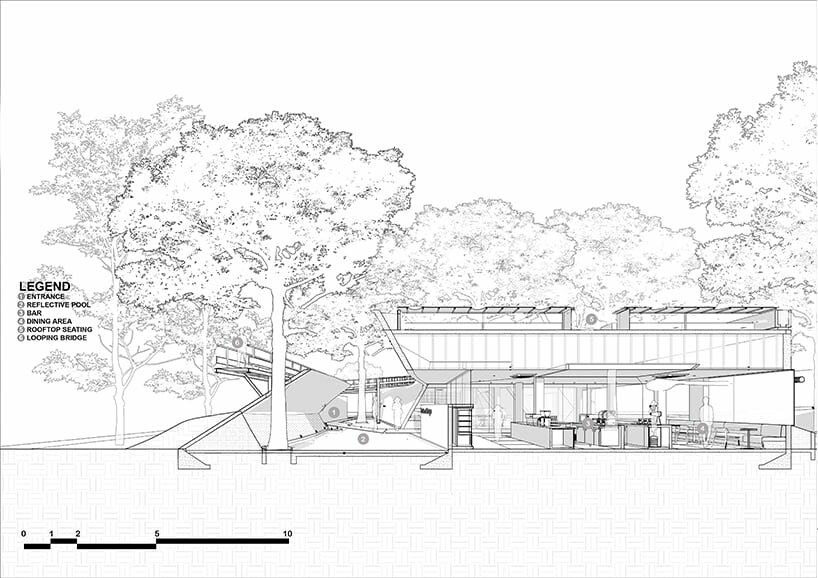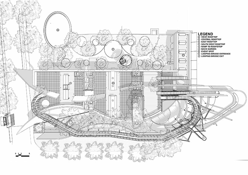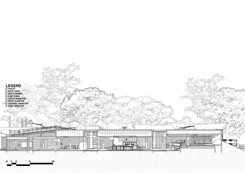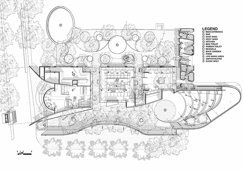 the project sits like a ring placed over the terrain, with its funnel-like roof forming a shaded perimeter walkway and an introverted core.