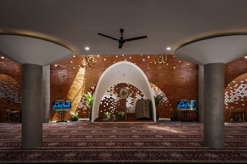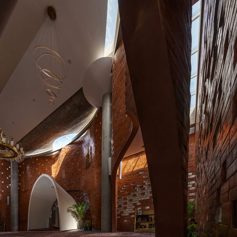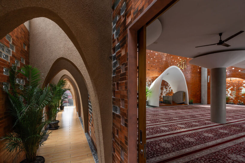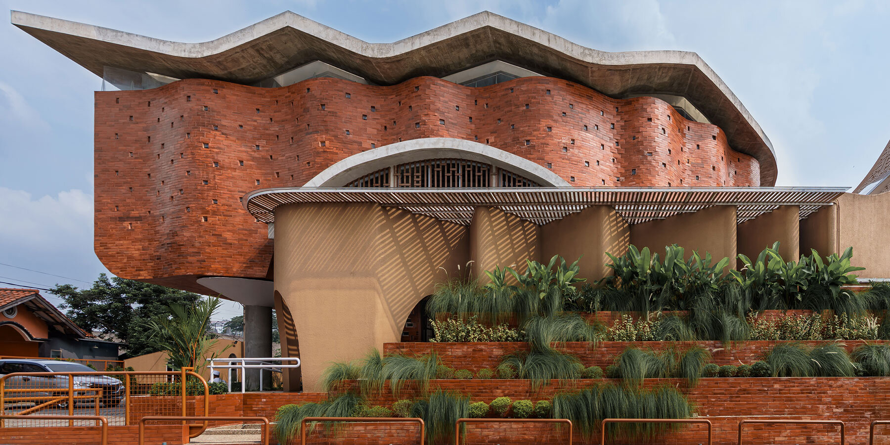 the project sits like a ring placed over the terrain, with its funnel-like roof forming a shaded perimeter walkway and an introverted core.