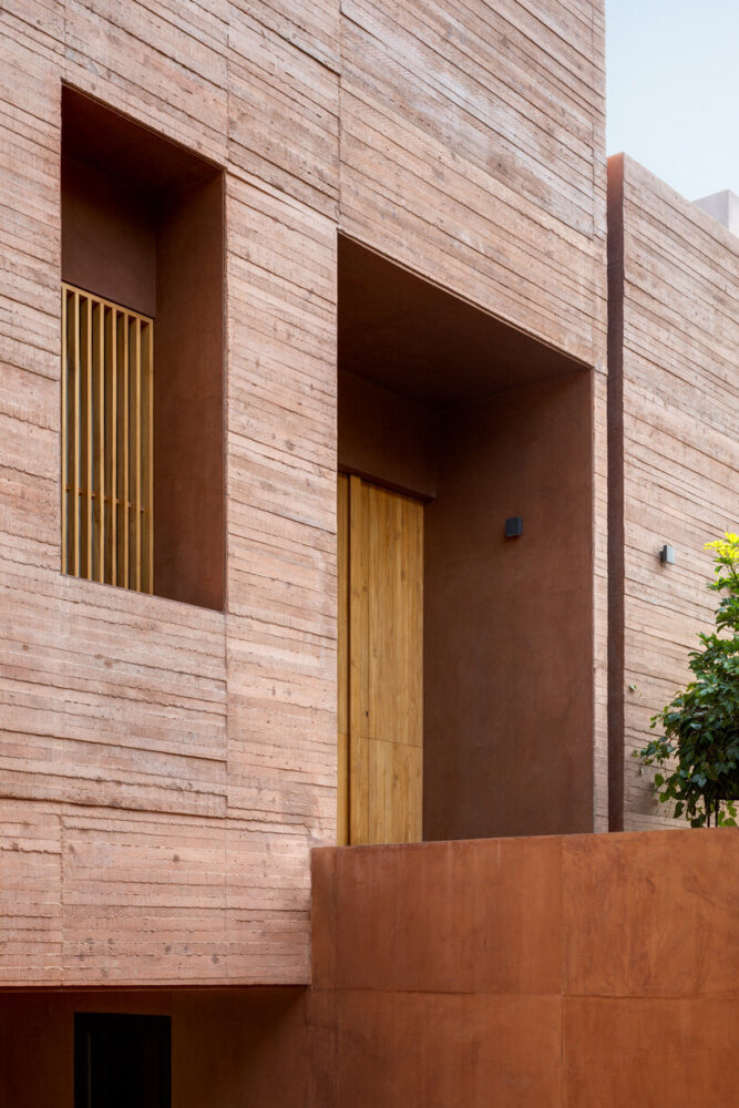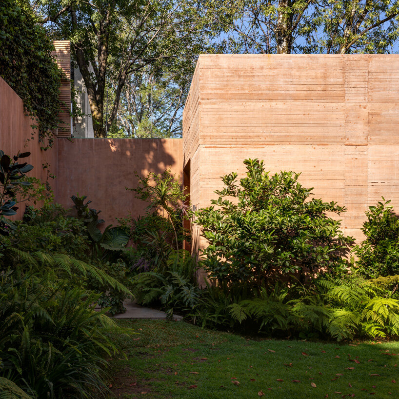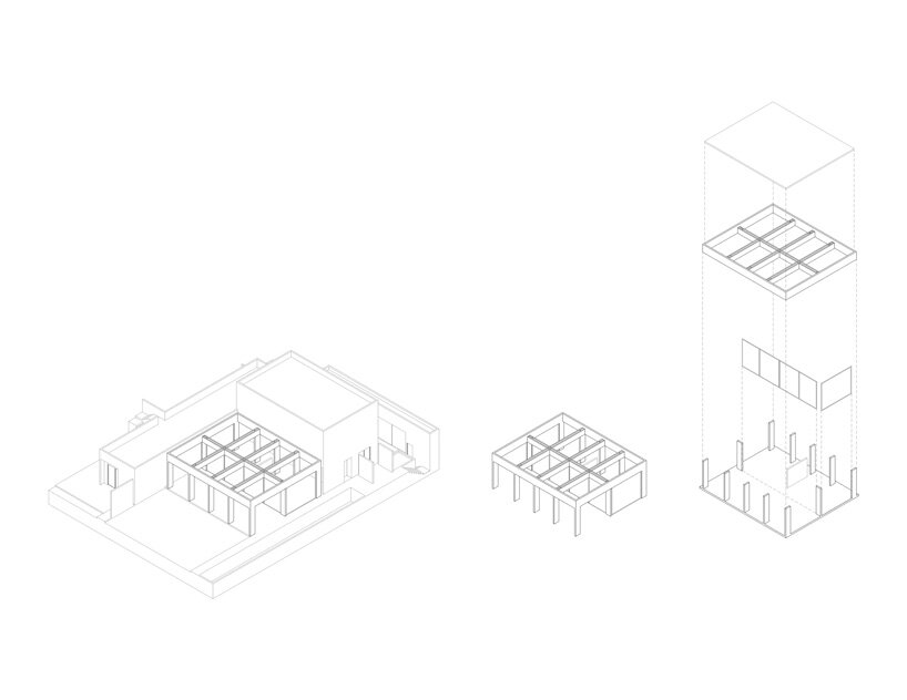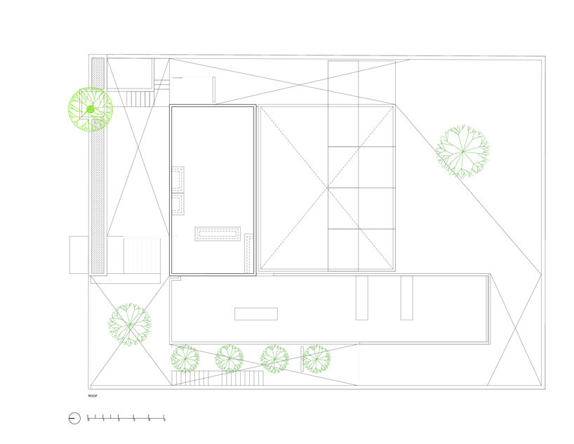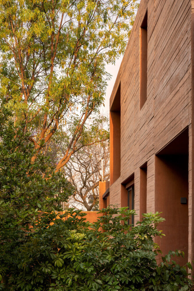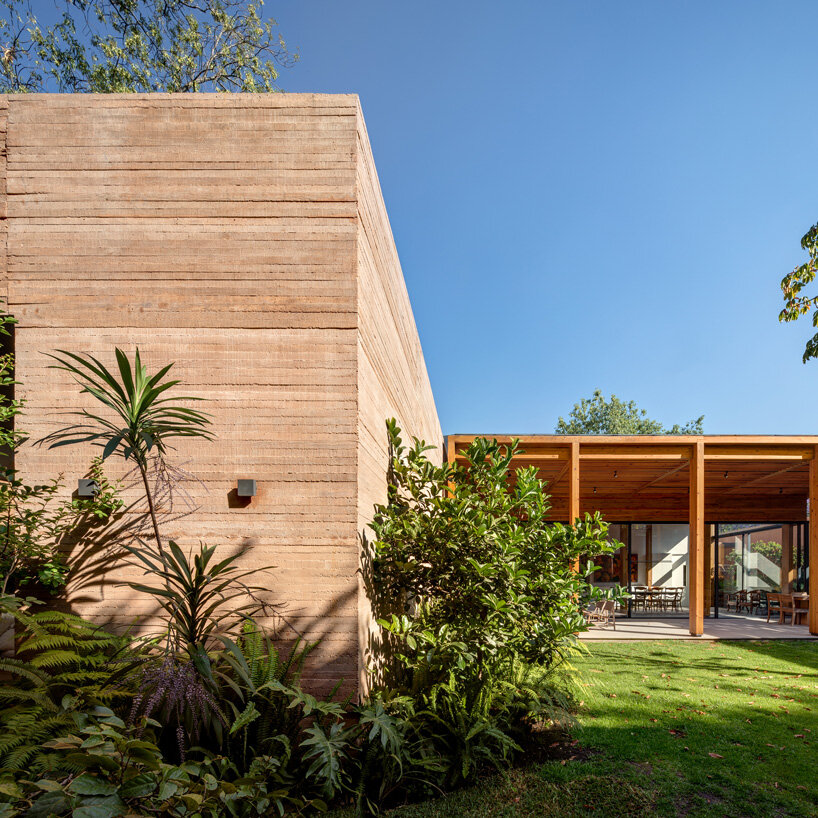 the project sits like a ring placed over the terrain, with its funnel-like roof forming a shaded perimeter walkway and an introverted core.