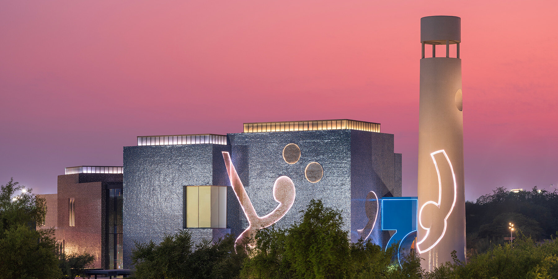 the project sits like a ring placed over the terrain, with its funnel-like roof forming a shaded perimeter walkway and an introverted core.