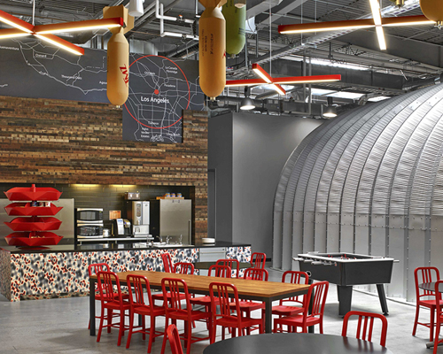 inside, the TMZ brand is expressed physically and visually, using pieces like a graffitied version of the hollywood sign and a map of LA highlighting the thirty-mile zone (TMZ) of hollywood-based studio. replica bombs hang over the lunchroom in reference to the company’s signature style of news reporting.