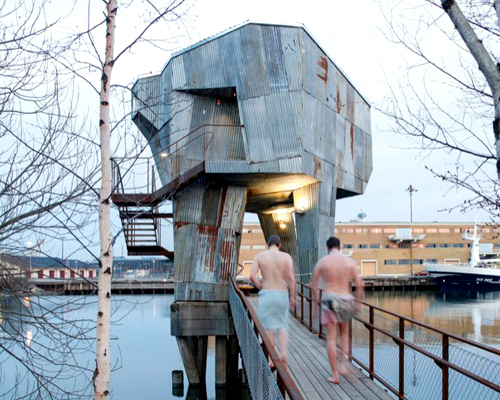 berlin-based studio raumlabor has created a sauna building called ‘goteborg bathing culture’ in frihamnen, the industrial harbor of göthenburg in sweden. the area is gradually losing its industrial character and is steadily becoming a new and central part of the city, open to be discovered and adopted by the citizens. its present state of transitions, the traces of its former uses, and the huge undefined spaces make the harbor very attractive for the establishment and implementation of different kinds of cultural activities. apart from the polluted land and water, the heritage of this industrial port is a series of fascinating functional objects, buildings and the spontaneous and fragile nature that somehow exists between the asphalt, concrete, and water.
