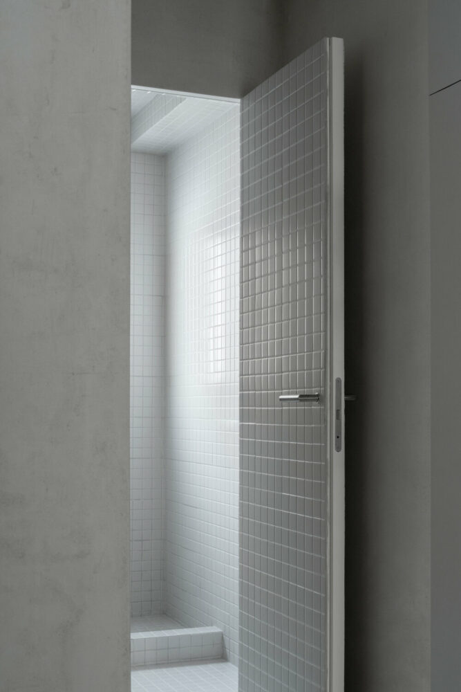 The apartment features continuous, reflective epoxy resin flooring, which contrasts with the ‘grotesque’ and cavernous presence of the splashed plaster ceiling. Durable and waterproof ceramic tiling clads the kitchen’s working station and bathroom. The environment, grey and monotonous, a result of the ‘nakedness’ of the space, is elevated with limited detailing in local red marble.