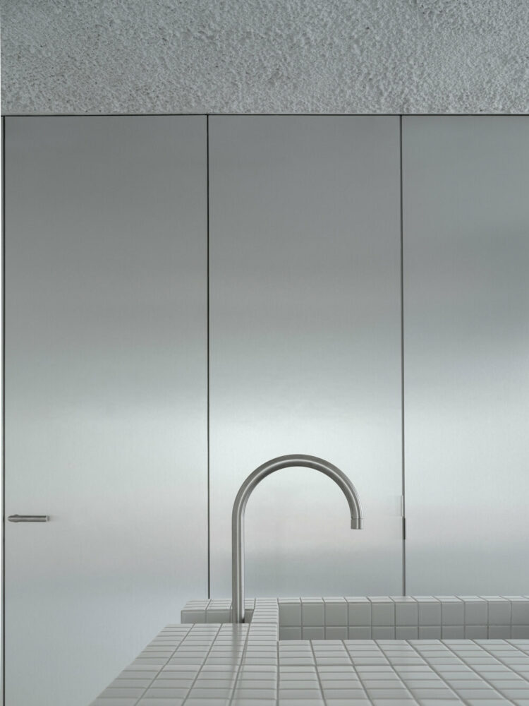 The apartment presents a ‘blank canvas’ through a simple but refined materiality that includes reflective, continuous epoxy resin flooring, raw aluminum, steel L-beams and pillars, and ceramic tiling. ‘This naked scenario poses the possibility of allowing future interventions to occur and distances itself from market-driven logics in which finishes and fittings make for a large percentage of the developer’s profit,’ notes HANGHAR.