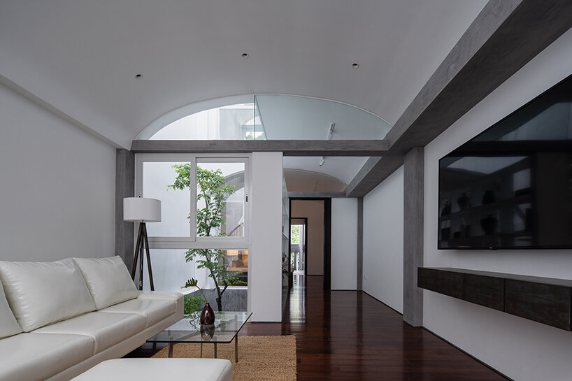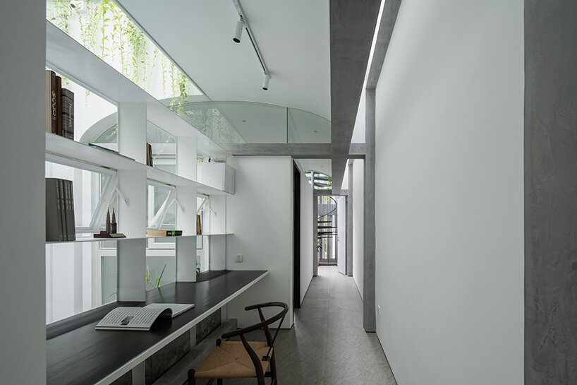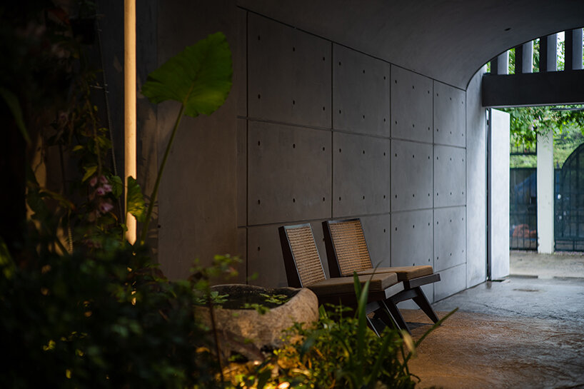 rear studio (see more here) completed the three-story ‘K house’ with gentle contrasts. to start, the ground floor’s domed entrance welcomes owners and guests into a private garden elevated by a single skylight carved from the thick gray ceiling. complementing the inner garden are four spaces holding a garage, living room, kitchen, and dining room. meanwhile, the second and third floors feature white-toned bedrooms and a common room. in contrast with the ground floor, both these levels introduce plenty more daylight into the house.