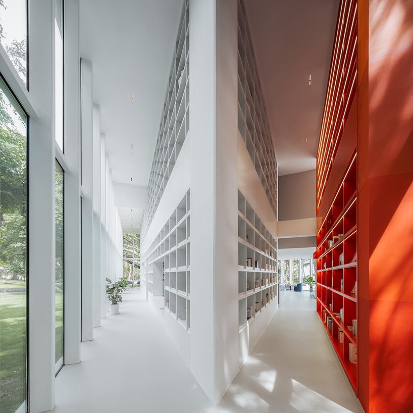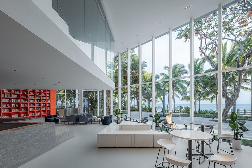 shanghai-based architecture firm wutopia lab has completed yet another bookstore, this time in the scenic area of tianya haijiao, also known as ‘the end of the earth’ in china. the design seeks to generate a positive, pleasant environment that evokes the tranquility and simplicity of the calm ocean. the architects have designed a transparent all-glass exterior, placing bright red bookshelves inside to generate bright pops of color, infused with expressive symbolism.