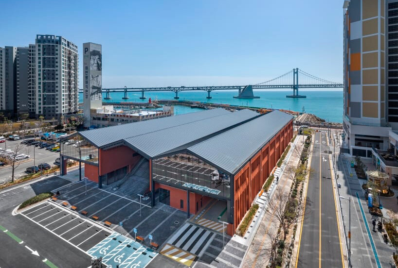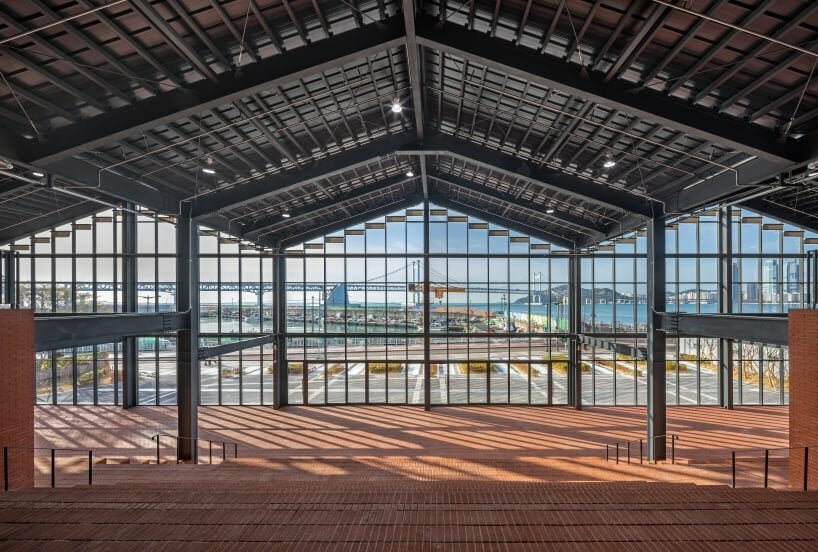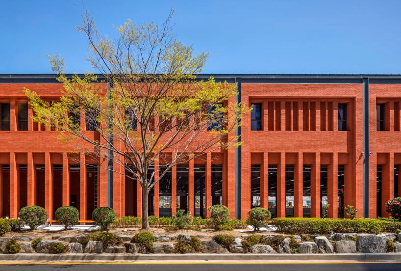 the project sits like a ring placed over the terrain, with its funnel-like roof forming a shaded perimeter walkway and an introverted core.