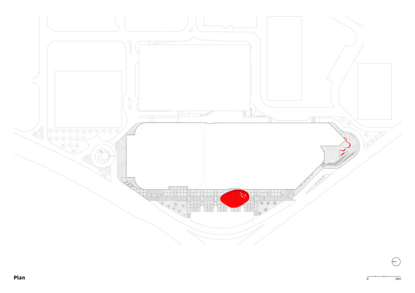 the red, stylized features highlight the main entrances to the Indoor Shopping Mall, guiding visitors on foot or by car