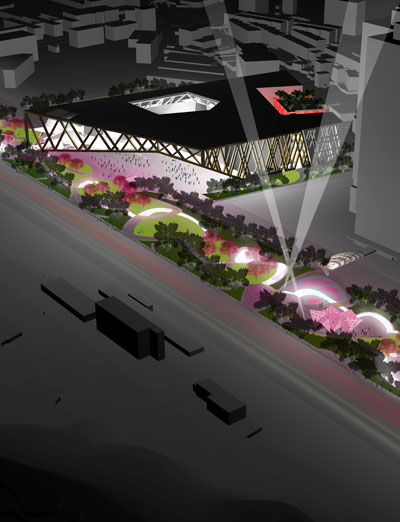 the outdoor amphitheater combines the concept of circus and city with its mobile stage. the robot theatre can adapt to a spectrum of event scales. the four docking positions along the elevated public ground can accommodate a range of audiences from 16000 to smaller shows operating simultaneously with other functions such as night markets. in its most compact crystalline form, the robot theater docks with the hall of fame creating a more intimate performance space. a technological net provides solar screening and LED lighting to the outdoor amphitheater, and connects the hall of fame, the robot theater and the main hall together.