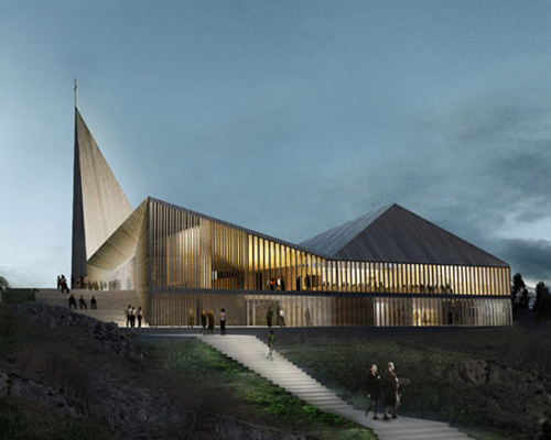 the project sits like a ring placed over the terrain, with its funnel-like roof forming a shaded perimeter walkway and an introverted core.