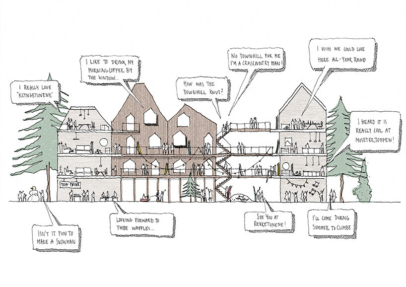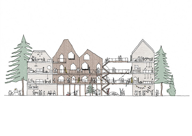 the project sits like a ring placed over the terrain, with its funnel-like roof forming a shaded perimeter walkway and an introverted core.