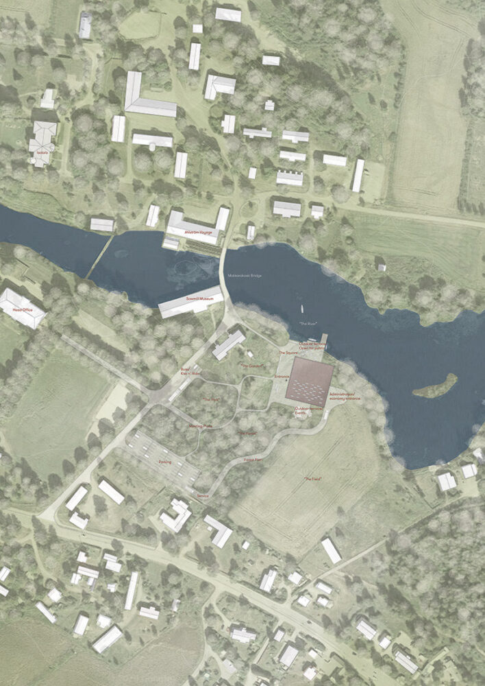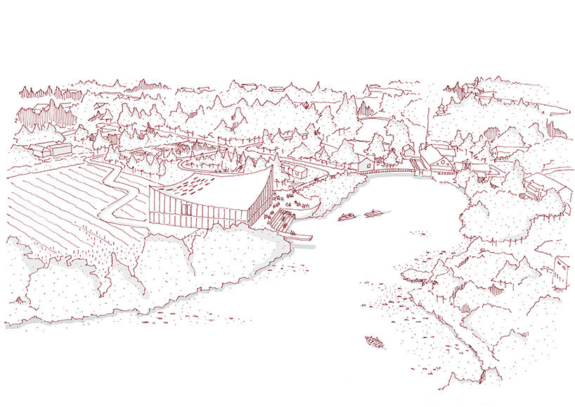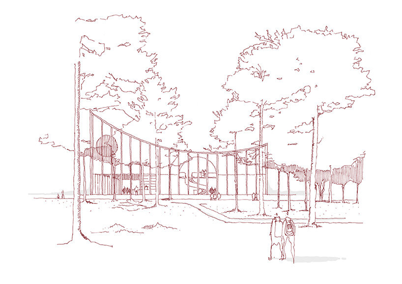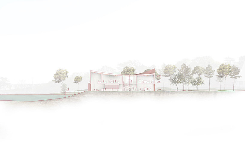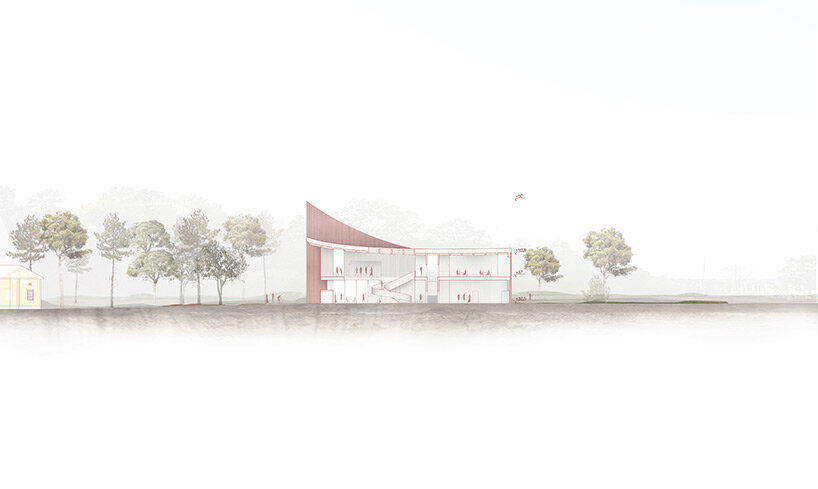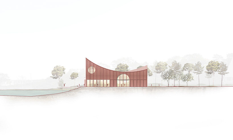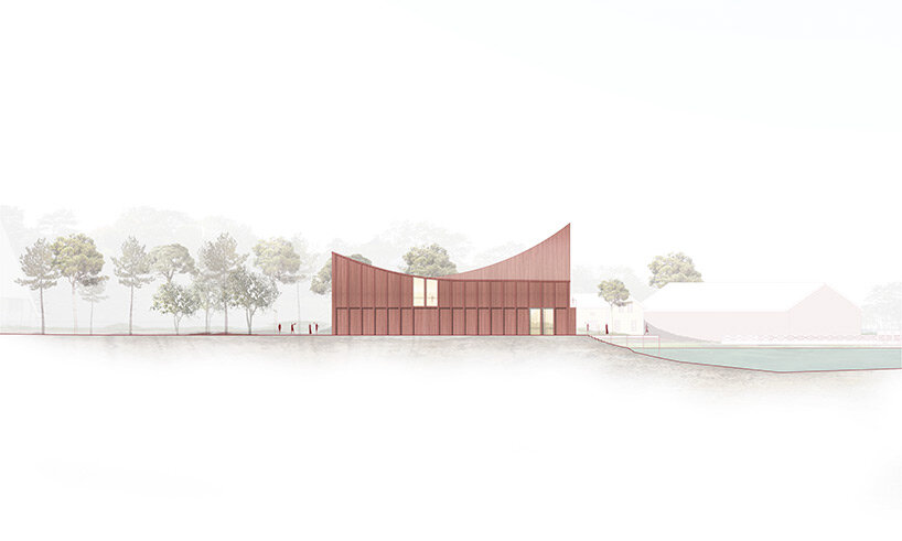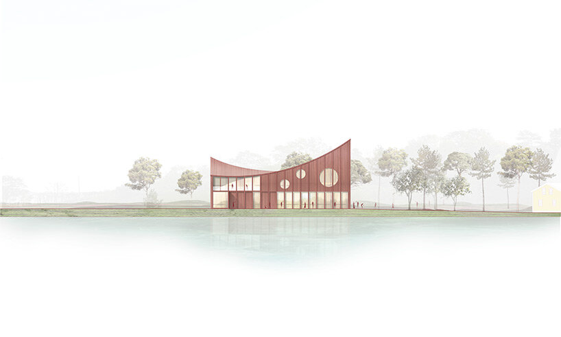 norway and denmark-based architectural firm reiulf ramstad arkitekter has unveiled its proposal for a new art museum in noormarkku, finland. dubbed ‘brädgården art works’, the design is based on a simple and clear idea: embracing the meeting between people and art with an appealing spatial composition. the resulting project takes shape as a geometric structure with a curved soft roof and playful circular openings punctured through the façade.