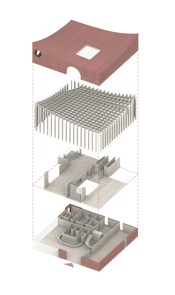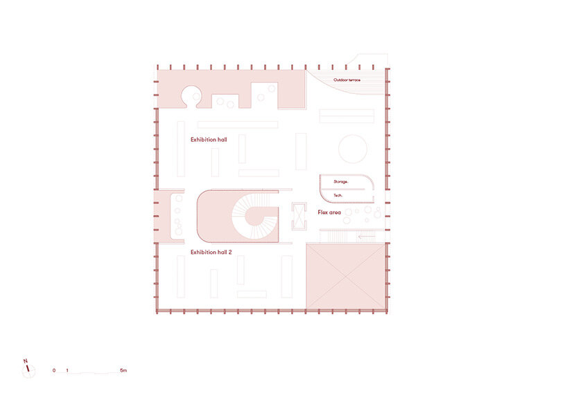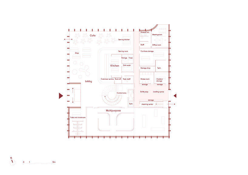 the scheme has a clean square floor plan on two levels. the ground floor welcomes the public and houses the main facilities: lobby, cafe, multipurpose space, and operation areas. the two more permanent exhibition spaces are organized freely on the second floor. the two levels are connected by generous stairs and a large double-sided lift. this provides great operational flexibility and varied possibilities for many types of use, such as exhibitions, events, and gatherings.