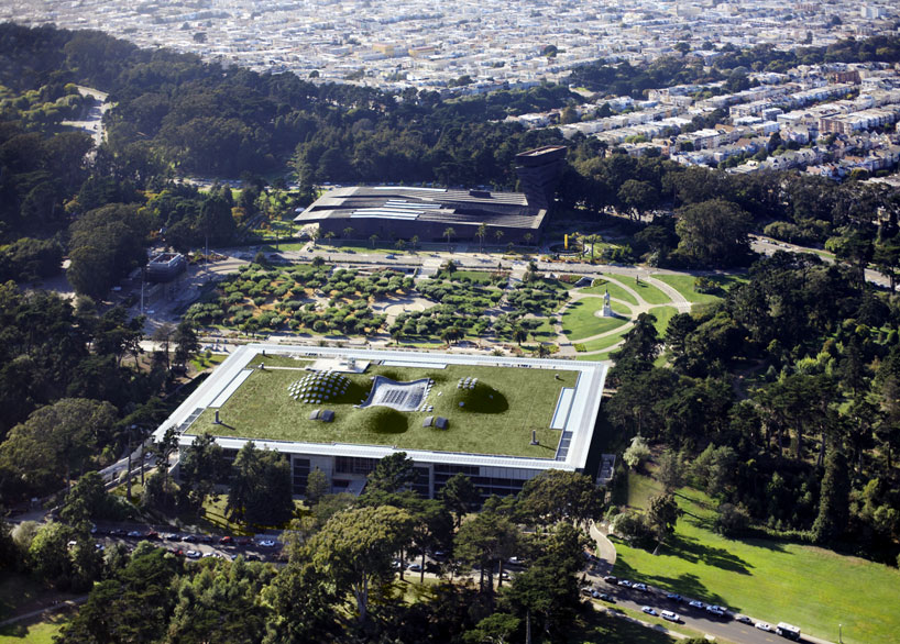 renzo piano’s california academy of sciences is among the largest museums of natural history in the world. the living roof’s 1.7 million native plants were specially chosen to flourish in golden gate park’s climate, and provide controlled natural ventilation. the california academy of science — or AOS — designed by renzo piano consists of two buildings, each with approximately 27.43 m high, free-standing glass domes that house the planetarium and the living rain forest. a glass-covered piazza covering 183 square meters and approximately 1,160 square meters of variable exhibition space lies in between. the now five-year-old facility dramatically increased its reach and impact, doubling from about 750,000 to 1.5 million visitors annually and nearly tripling the number of students it teaches through fieldtrips and after school programs from 62,000 to 175,000.