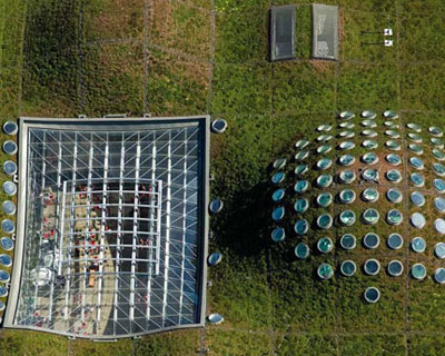 the two main domes cover the planetarium and rain forest exhibitions. the domes are speckled with a pattern of skylights automated to open and close for ventilation. while inside the glass-covered ceiling and facade elements in the piazza provide visitors with a view into golden gate park, the outside of the building looks just like part of park from a bird’s eye view. this is due to the fact that a majority of the roof areas comprise a green roof covering about 10,118 square meters occupied by 1.7 million native plants. according to renzo piano, the CAOS is intended to integrate into the scenery of the park like a gentle rolling hill and to use its striking domes to invoke the feeling of the seven hills that san francisco is famous for.