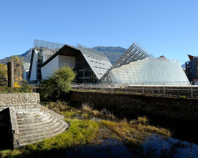 the new science museum of trento, italy, dubbed MUSE and designed by renzo piano will open its doors tomorrow after a full week of 24-hour programming. the 12,000 square meter space is dedicated to exploring the relationship of man and environment in myriad ways. six floors retrace the full natural history of both the alpine region and the rest of the world, beginning with a small-scale, immersive re-creations of the world’s biomes, meandering through publicly accessible research labs and ending with a slew of didatic showcases. MUSE will be host to the alpine region’s largest dinosaur exhibition a museum inextricably linked to its site, MUSE will extensively explore the formation of the dolomites and the birth of the alps– facets of the programming expressed in both the form and tectonic makeup of the architecture. steeply angled, glazed roof plates recall the profiles of nearby mountains. the dialogue of nature and technological development is also mirrored in the building’s expertly composed masses and voids that allow exhibits to remain otherworldly and immersive while crisp, white volumes and ample glazing tie in advanced 360 degree projection and interactive digital features. aside from interiors characteristically illuminated by diffused sunlight,  locally sourced materials, a low-impact tectonic palette that includes bamboo cladding and a cistern system for rainwater recovery are part of a greater plan to achieve LEED gold status. the museum will also employ a reatracable shading system, solar panels and geothermal probes. MUSE is a testament to the wonders of the earth-forged built form and the life such forces begot– and the building is an appropriate response of streamlined horizontal planes and abstracted masses to house the important repository of knowledge.