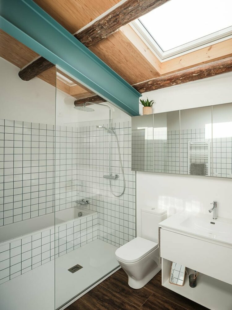 wooden beams are repurposed for the roof and furniture elements like shelves, tables, and bathroom cabinets