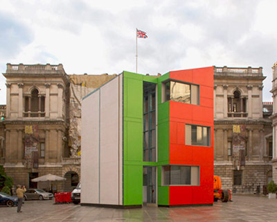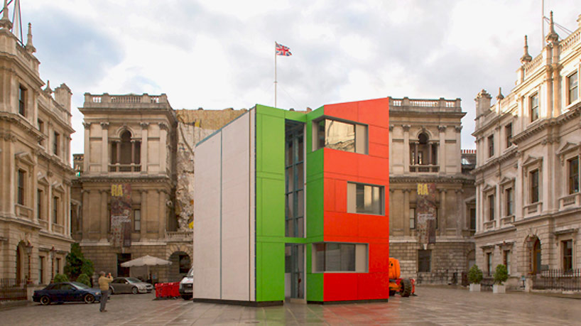 drawing from richard rogers’s pioneering building system for the oxley woods, a sustainable housing development near milton keyes in england, ‘houseshell’ has been installed in the courtyard of royal academy of arts in london.  although the flatpacked home will be on view during the architect’s retrospective ‘inside out’ at the school, the three-and-a-half storey building will be dismantled and re-used as part of a social housing project with the YMCA london south west, entitled ‘y:cube housing project.’ the highly adaptable home is posited as a possible solution to the UK housing crisis, in particular for urban infill or small sites wherein the logistics of construction greatly inflate home prices. the building requires a mere 24 hour assembly period and arrives on the site as flat-pack panels, both factors that make for a cleaner construction process and allow streamlined retrofitting and extension projects. the typology has further developed from the CMYK oxley woods scheme, namely with the adoption of insulshell, a fast-track closed frame timber system with robust insulation technology. the off-site fabrication process opens up cost-efficient possibilities for a variety of social objectives and will enable the development of some 32,400 hectares worth of vacant brownfield sites in england, many of which utilize existing transport and infrastructure links. visitors will have an opportunity to see houseshell against the palladian background of the burlington house through september 8th 2013.