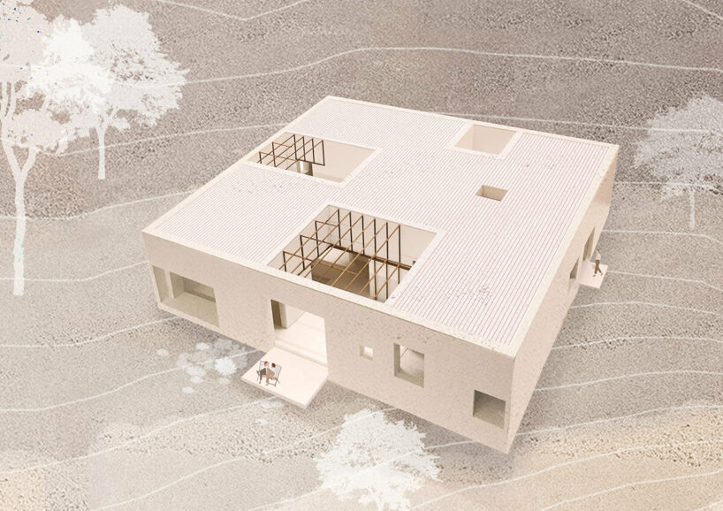 Embracing the topography, RipollTizon’s House in Puntiró, Mallorca takes shape as a terraced dwelling designed for two families and frequent guest visits. The architects organize the project to comprise two independent private areas. Each section includes a master bedroom, an adjoining multipurpose room, and a bathroom, complemented by standard shared spaces. The floor plan, almost square in shape, strategically places private spaces on adjacent sides, ensuring independence for each family while shared spaces are organized along a diagonal axis oriented towards views over Mallorca. Three unique courtyards each serve as thresholds. One of the courtyards, covered with a light structure supporting climbing plants, creates a shaded, semi-outdoor living area.