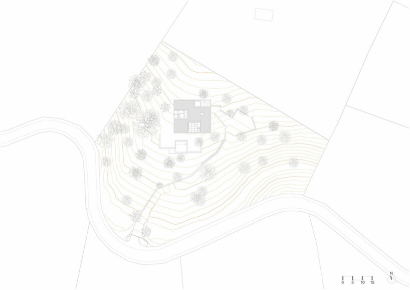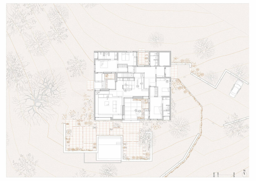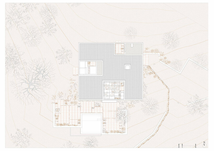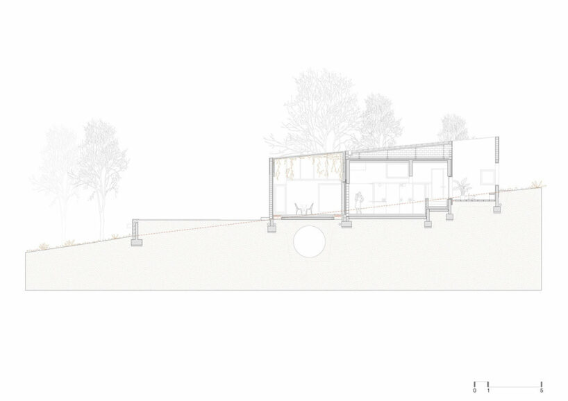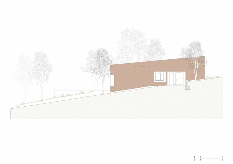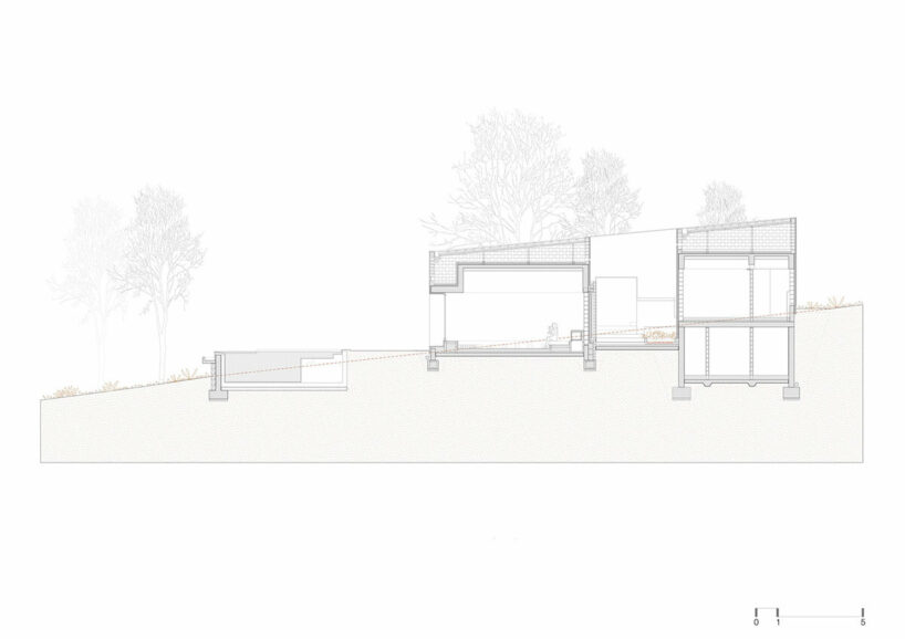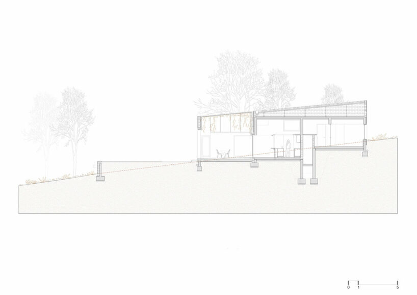 the dwelling is embedded into the hill, unfolding across levels to connect with the landscape