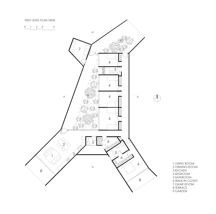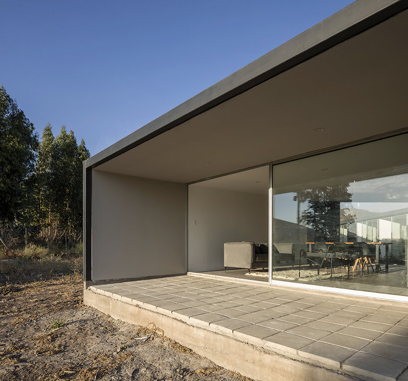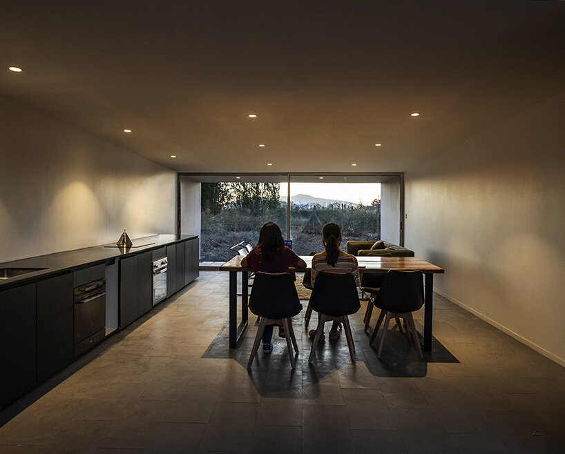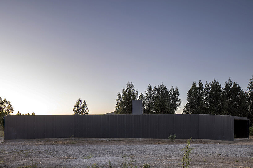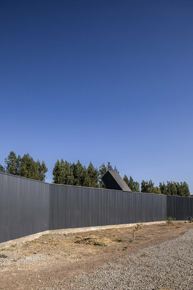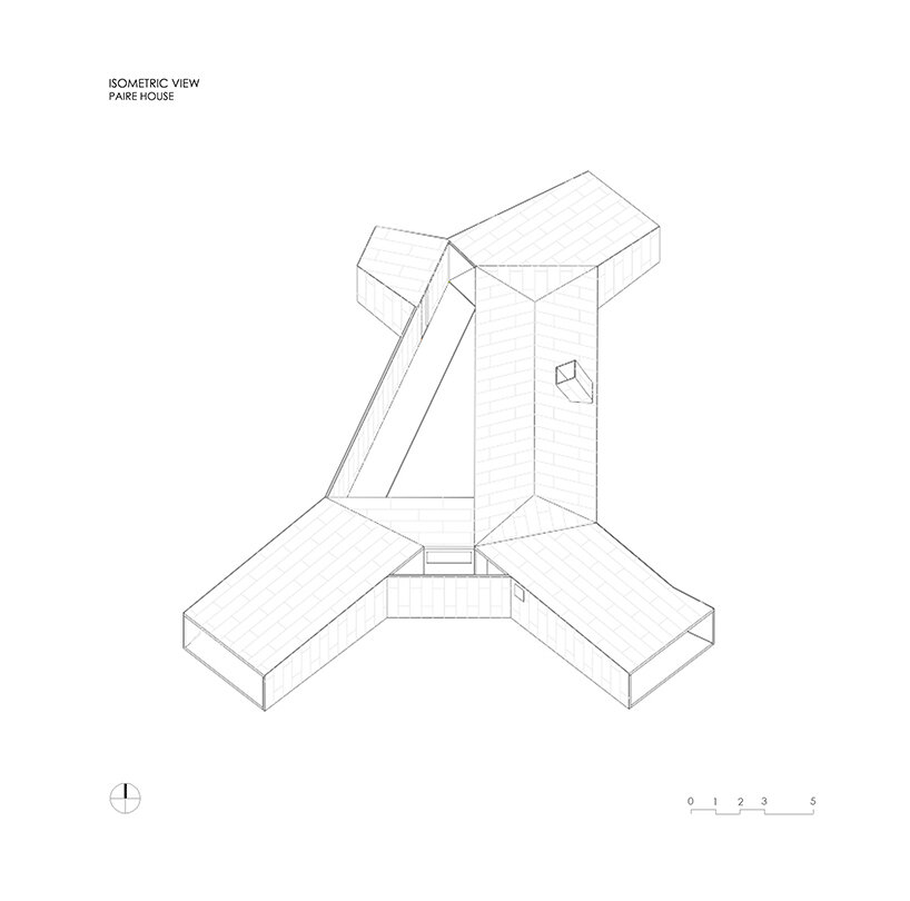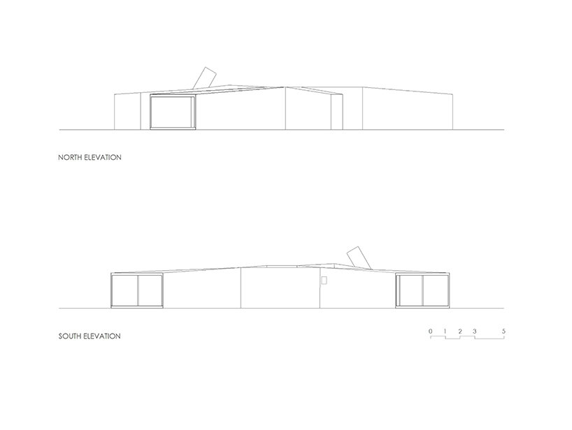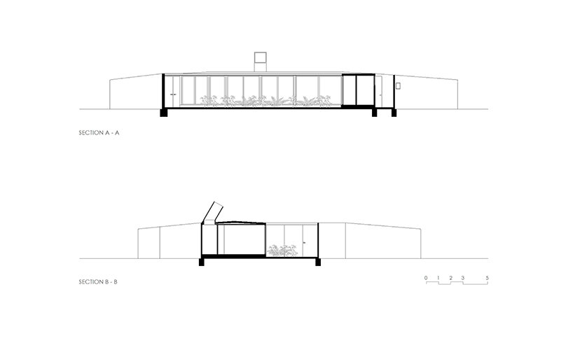 the project sits like a ring placed over the terrain, with its funnel-like roof forming a shaded perimeter walkway and an introverted core.