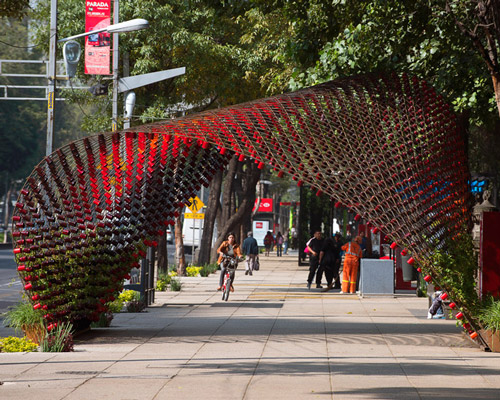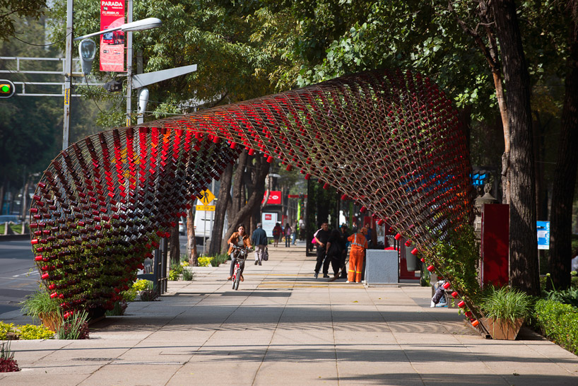 visitors pass through the shell made from rebar and 1,497 coffee cups