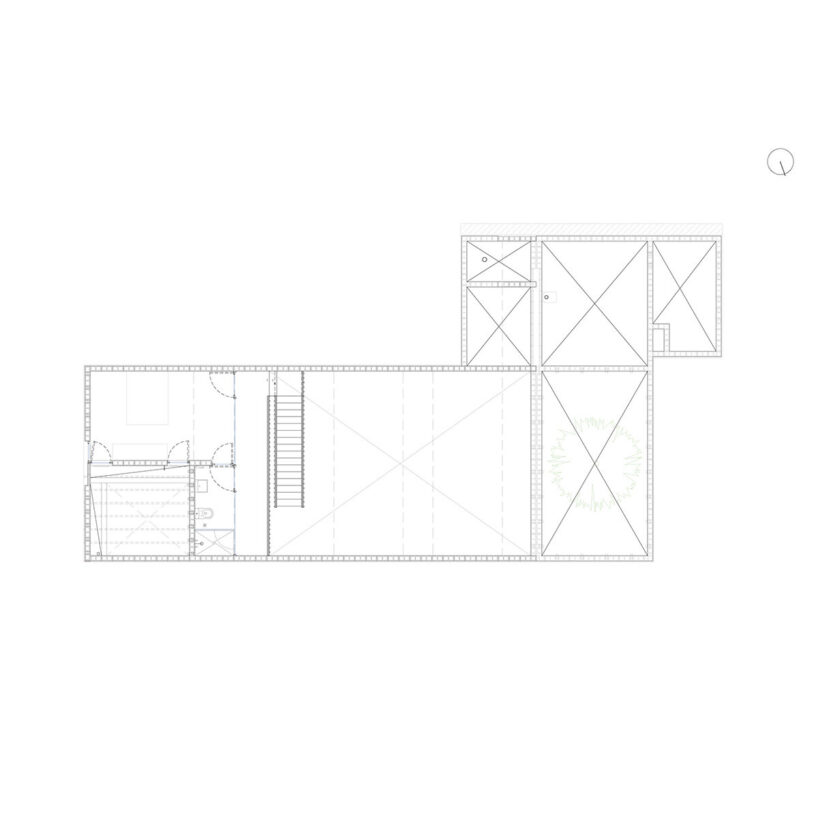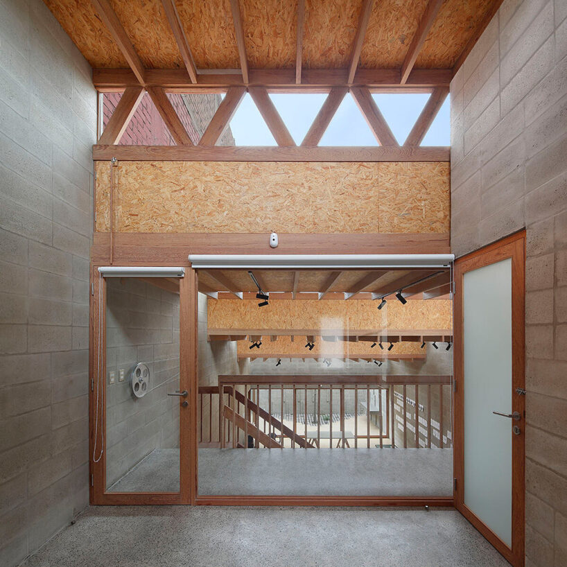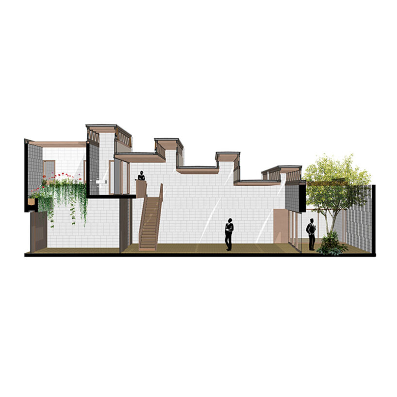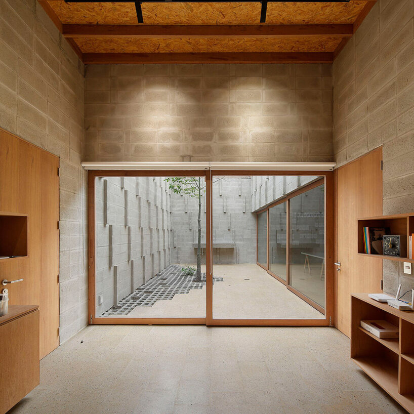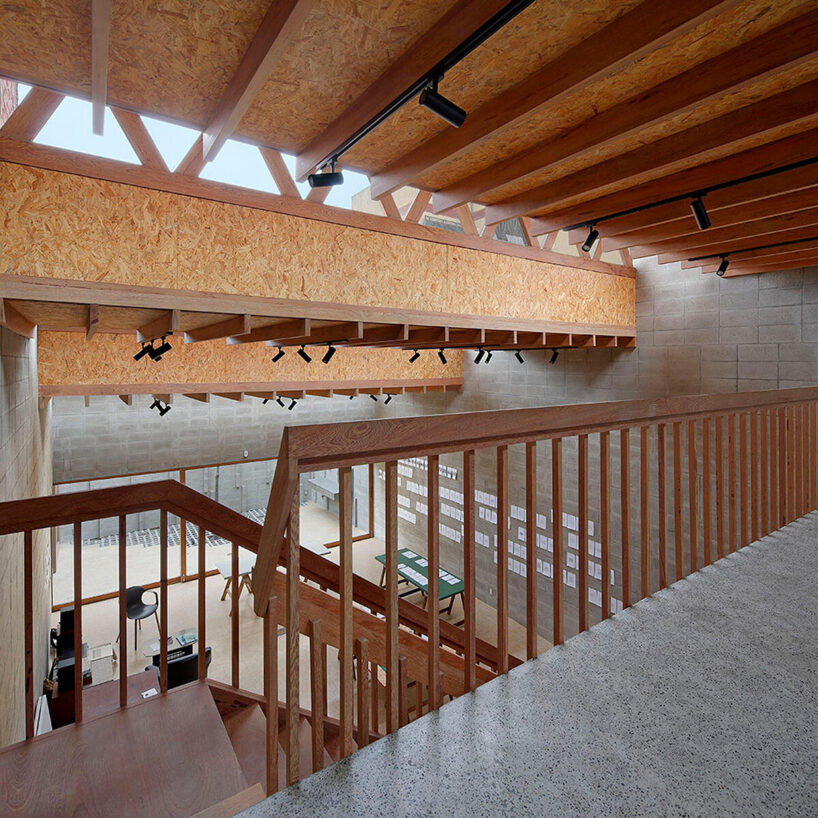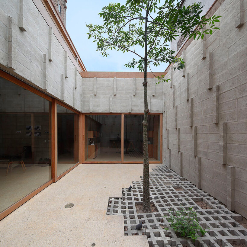 the project sits like a ring placed over the terrain, with its funnel-like roof forming a shaded perimeter walkway and an introverted core.