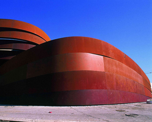 rendering of the 5 sinuous COR-TEN bands which envelope the building