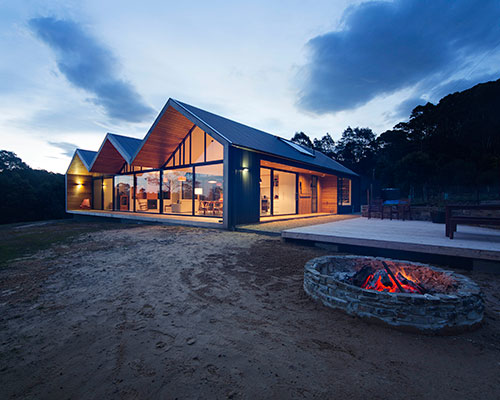 australian studio room 11’s lookout house is the result of a successful melding of two building typologies: the courtyard house and farmhouse. three recognizable gabled metal roofs are oriented towards a descending hill, the southern ocean and tasman island. the entryway is marked up deep overhangs whose soffits and entry wall are clad in cedar planks. a sliding barn door is almost invisible in the facade, save the black metal tracks. upon entering, the central exterior courtyard is made visible, with the ocean views beyond. the two larger canopies contain the social living areas wrapped in full-height operable glass panels that allow the spaces to spill into the outside; the bedrooms are situated in the smaller, more private side of the structure. unlike the entry facade, the opposite end of the home is marked by a facade of glazing opening up panoramic views.