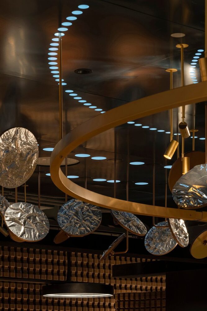 among an affluent neighborhood in the central area of shanghai, the chinese interior design studio roomoo has completed ‘halation bistro and lounge‘. the design team formed a meticulous and unique design, inviting guests into an imaginary universe: large infinity mirror pendant lamps, metal ceiling surfaces, and disc devices hover like planets and meteorites. according to different usage requirements, the main space is divided into four seating areas (coffee zone, beverage bar area, central dining space, and card seat area) and one delivery corridor to keep each site corresponding privacy. roomoo's halation bistro invites guests into an imaginary universeall images courtesy of roomoo