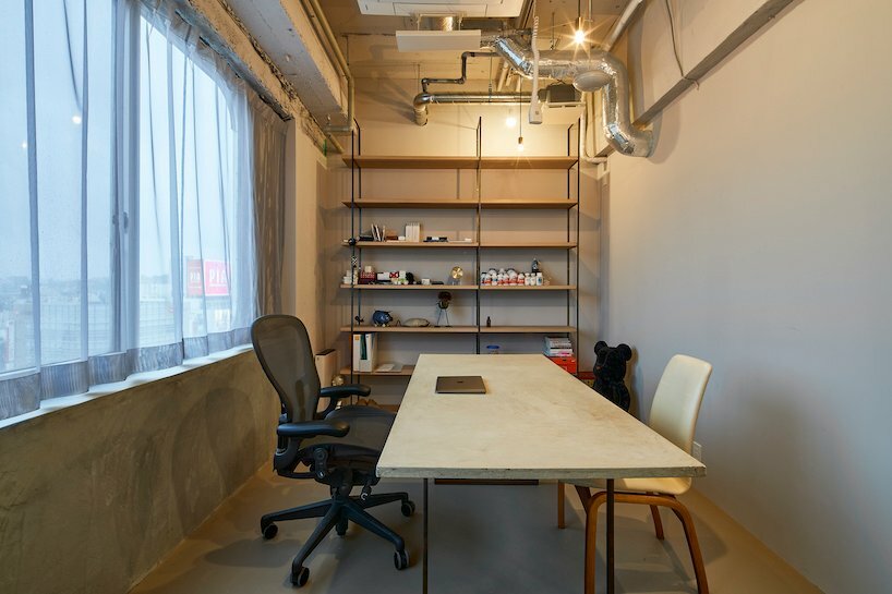 To block out noise from the outside public units, Sato ensured that the entrance hall didn’t lead directly to the main office. Instead, two doors lead to different spaces; a front door to the workplace and a side door to the meeting room. The latter is also accessible from the main space and provides guests with a homely, welcoming atmosphere. ‘Indeed, the entry and meeting room pavements are the only finished floor, as opposed to the raw concrete used for the other spaces,’ notes the practice.