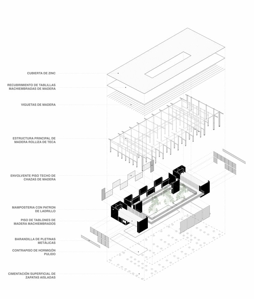 A patio with endemic vegetation is proposed by the design team as a meeting and exhibition place that is contained by two side naves and a central one, consisting of theoretical training classrooms, a cafeteria and hygienic services, practical learning workshops, a sleeping space, warehouses, and a store to sell the products developed in the central nave where the artisan fabrics are made. The main front is a productive-exhibition gallery that serves as a filter for the patio and as an element to generate urbanity towards the street. While the rear face is closed towards the dividing space to generate greater control of natural light, ventilation, and security, through the alternation of fills and voids.