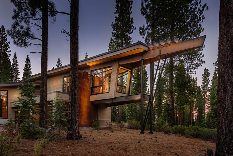 california-based sage architecture crafted a midcentury modern mountain home in the martis camp development of truckee, california, unlike any you are likely to find in this environment. named the ‘flight house’ for its metaphorical escape from city life but also due to its layered airfoil roofs that hover over the living spaces beneath. on one end of the home, the great room is set firmly on the ground with an exposed concrete slab-on-grade floor that contains radiant heating and serves as thermal mass collecting natural heat from the sunlight. the shape of the roof is carefully designed so as to shade the interior during the summer but it’s curving form opens more surface area in the winter time for natural light and welcomed heat gain. as the topography slopes to a lower elevation, the structure gradually rises under a skyward-sloping canopy until ending in a suspended glass box providing more of a tree house experience amidst the surrounding foliage.
