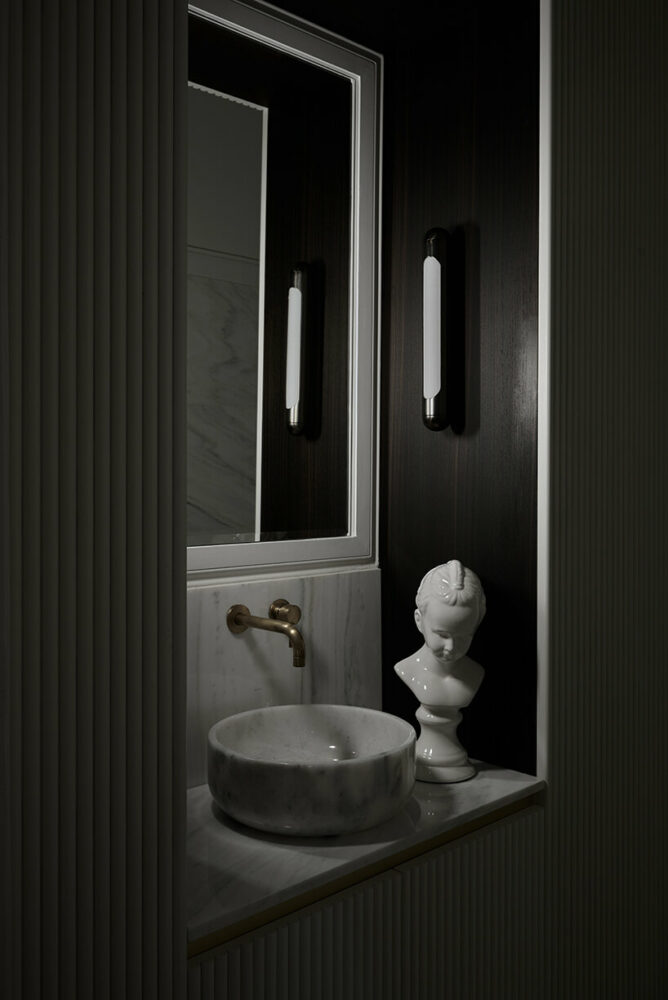 sleek bathroom space boasting Greek marble surfaces