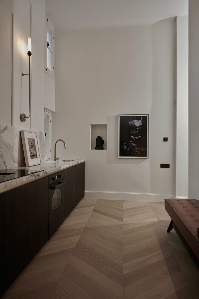 The Upper House apartment’s recent renovation by Saint of Athens (see more here) and A&O Architects (more here) joins together a selection of premium materials and appliances — chevron wood flooring, Greek marbles, Internet of Things (IoT), state-of-the-art heating and cooling technology — resulting in a sui generis combination of retro aesthetics and modern convenience. Complementing the overall eclectic atmosphere are a perfectly preserved one century-old wooden staircase, two reception rooms (living rooms), a dining area, a master bedroom with a walk-in bathroom, a guestroom and a guest bathroom, a library, a kitchen, and a pantry. Together, they constitute parts of a functional home synthesis that blends practicality with fine craftsmanship and unique taste.