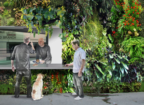 sander architects explored the idea of  ‘a building you can eat’ via ‘vertical garden’ outer walls covered with fruits, vegetable and herbs that the passerby can pick at.  an open street-side counter will also cater to walk-up orders.  ‘with this edible idea, the building become both environmentally and people friendly’. more images of the project can be seen here.
