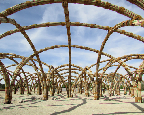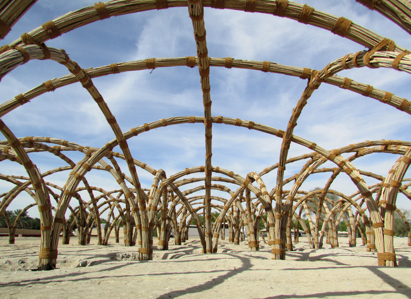 ‘there are a number of benefits to local communities using these simple structures’, continues dr piesik. ‘they use free, readily available date palm leaves, usually a wasted agricultural by-product, the structures are simple to erect by hand without the need for mechanical plant on site, they leave no lasting residue as the tensile fabric can be reused and the leaves are of course biodegradable, and the skill set to create the shelters is locally available. in addition, the potential for adaption of the design and its uses is wide; as well as storage these gridshell forms can also be used for education, healthcare, communal and ancillary buildings wherever an abundance of the natural building material grows.’
