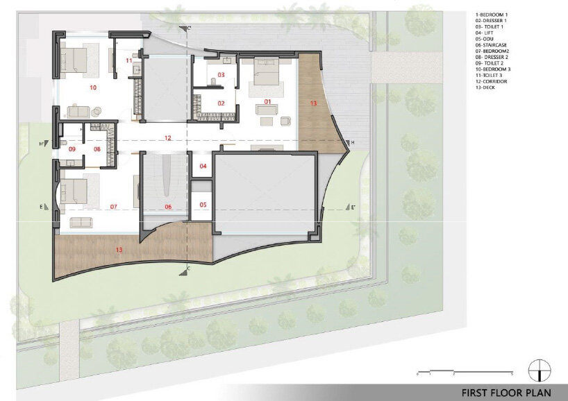 In section, the spaces are designed with varied heights, lending to an interesting play of volumes. Different parts of the house can be either lofty or intimate, with single-height bedrooms, a double-height dining area, and a living area of an intermediate, one-and-a-half level height.