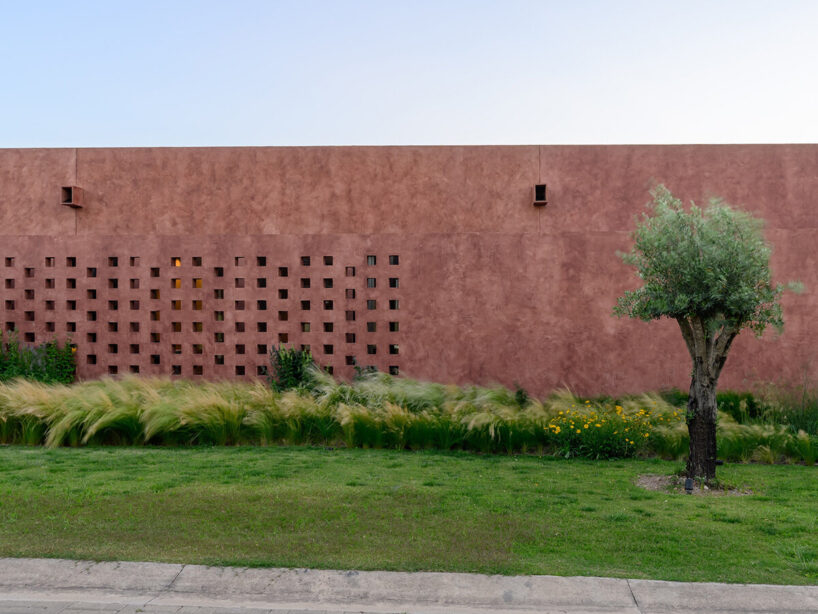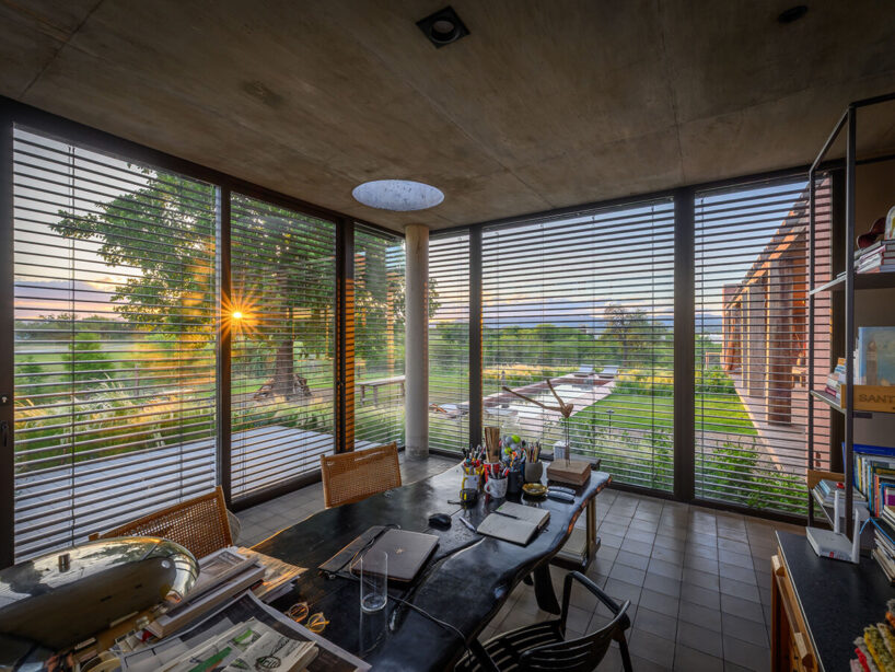 the project sits like a ring placed over the terrain, with its funnel-like roof forming a shaded perimeter walkway and an introverted core.