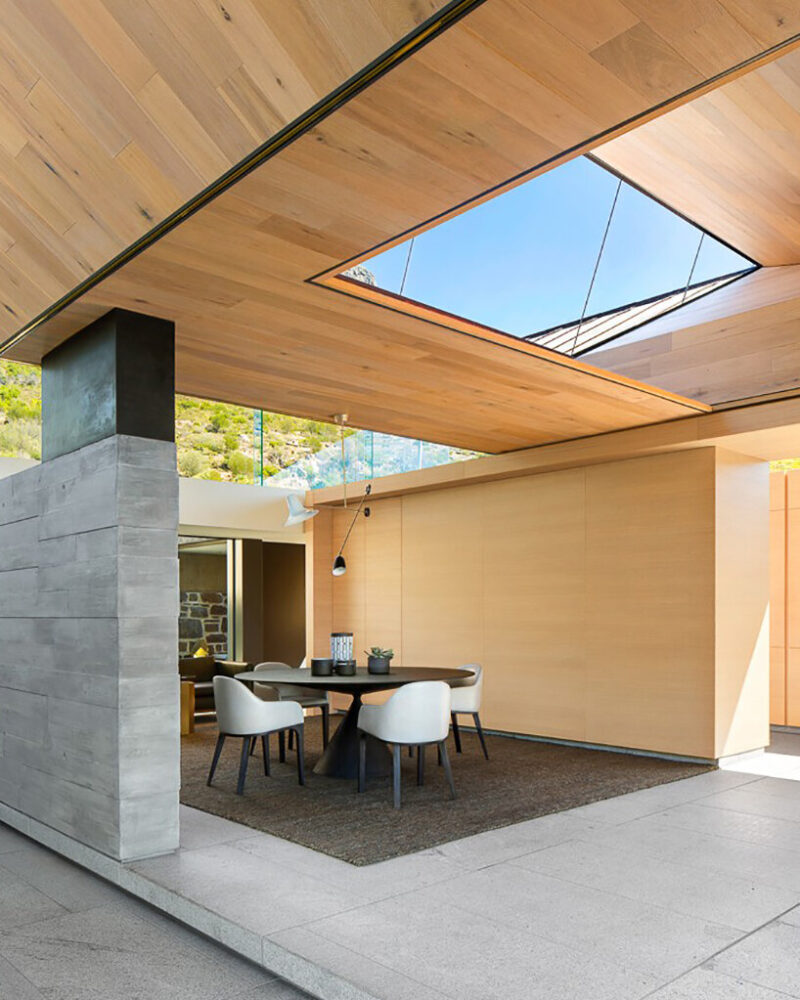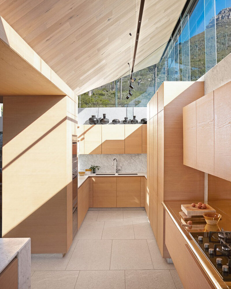 the SAOTA-designed kloof house is strategically built to exist in dialogue with the landscape surrounding cape town. rather than an enclosed architectural object, the structure is conceived as a ‘hat’ which shelters a formalized landscape. with the orientation of the house, the south african architects are informed by a heightened awareness of the movements of the sun and the moon emphasizes a sense of connection to nature and its cycles.