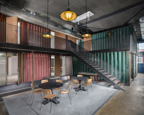 in developing the project, the architects sought to take advantage of shipping containers’ beneficial characteristics. standardized dimensions allow the units to be readily stacked, while the inherent resistance of the large steel boxes protects against vandalism and other forms of incidental damage. the modular nature of the design ensures that the scheme can easily be added to, or subtracted from, allowing a large degree of flexibility throughout the process.
