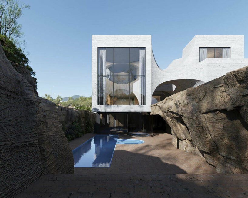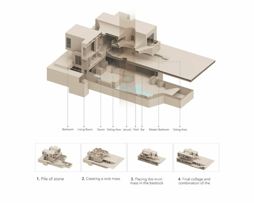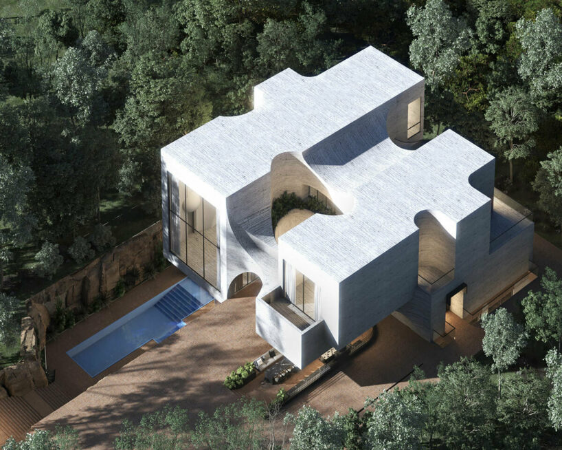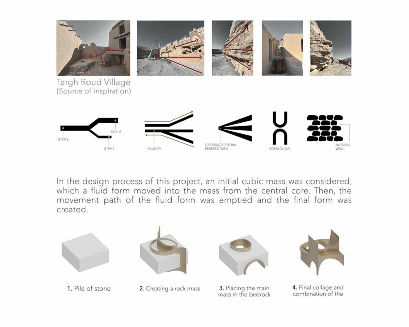 the project sits like a ring placed over the terrain, with its funnel-like roof forming a shaded perimeter walkway and an introverted core.