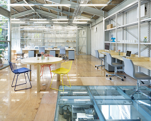 schemata architects renovated the former storage building at kiyosumi-shirakawa making the building open to outside and creating a continuous space where everyone can establish and be involved in the balanced relationship to stay aware of one another’s action and to collaborate for better results. in order to maintain such relationship across spatial boundaries, large-sized glass doors and screens were installed on each floor to maintain transparency between neighboring spaces, inside and outside, and lower and upper floors.