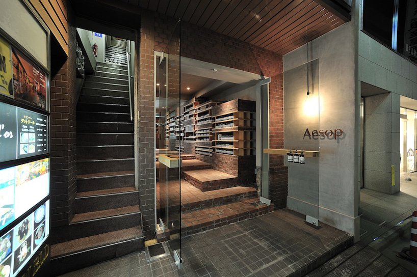 (left) brick and wood display (right) entrance to interior images © alessio guarino
