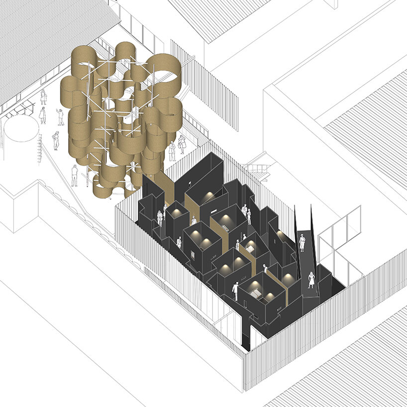 the project sits like a ring placed over the terrain, with its funnel-like roof forming a shaded perimeter walkway and an introverted core.