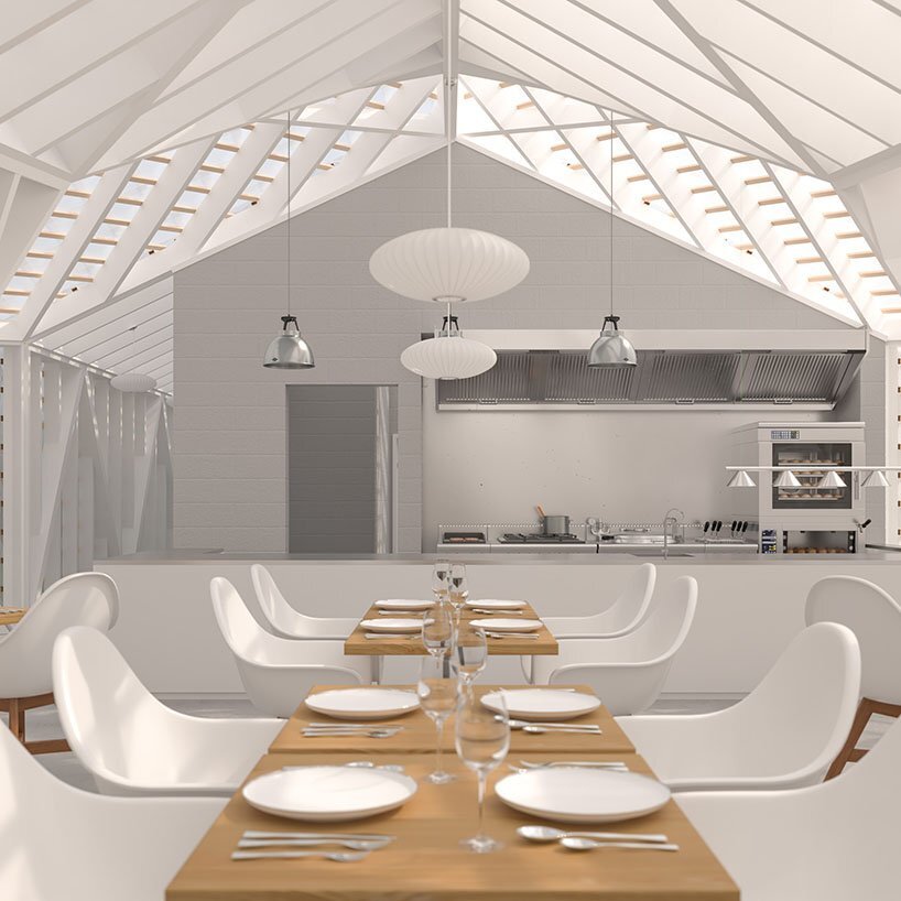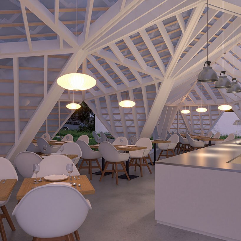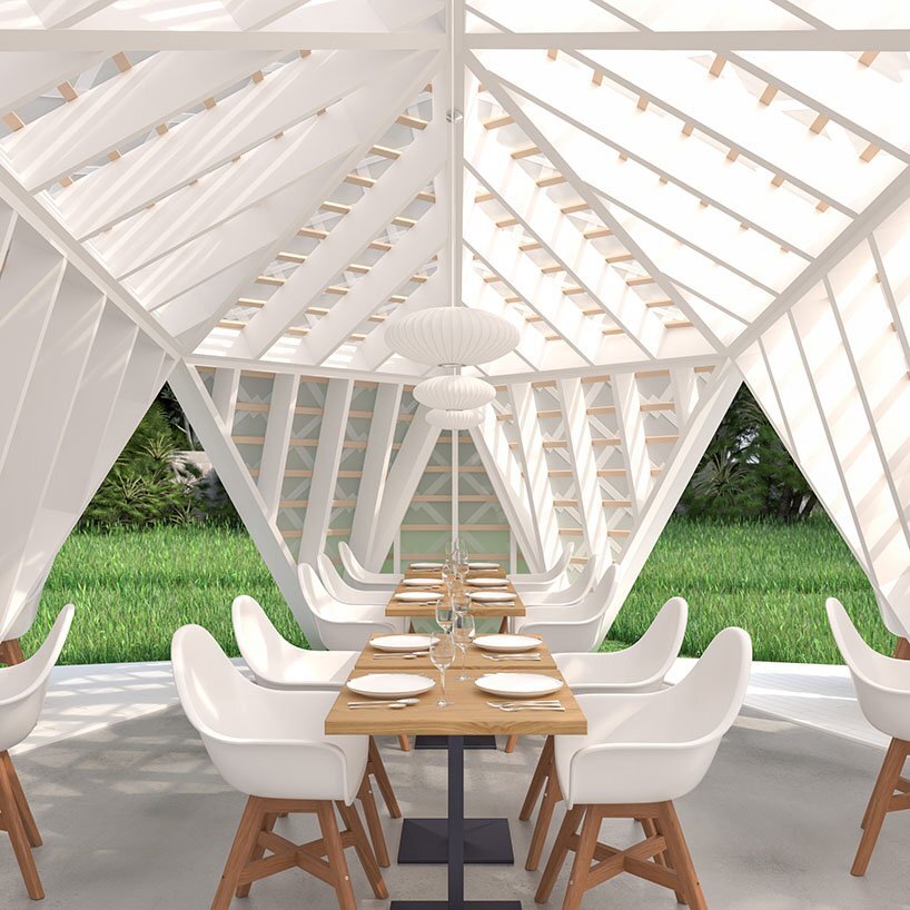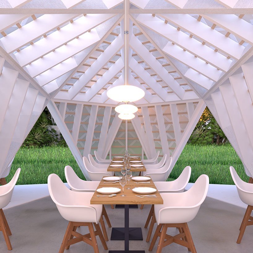 through conversation with the clients and jeg dudley of london-based engineers AKT, whitaker studio got the idea of forming a triangulated exterior for the structure. the restaurant takes shape as a sculptural shell made of polycarbonate shingles that open and close to facilitate ventilation. the doors are a natural extension of the triangulated form and fold down to create additional seating areas, accommodating from 32 to 40 guests. the project will be completed sometime in 2022, with the help of the engineers at simple works and local architect faiz toorabally.